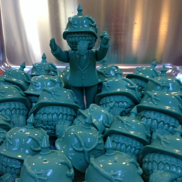 Frank Kozik‘s awesome Madball send-up, the Hateball, is set to receive an all-new online release in the form of a “Mint” 2 pack set! Featuring both the small and Mishka Bootleg compatible large versions, the 2″ and 3″ diameter balls have been produced in an unpainted mint green soft vinyl this time around. Limited to an edition of just 13 – with one lucky customer receiving the one-off Hateball Salary Man chase pictured centre – expect these on the Kozik store at some point later this week for $75 plus shipping. Keep track of the Frank Kozik Instagram feed here for the full lowdown on the release soon…