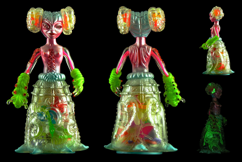 Bob Conge aka Plaseebo kindly shares his contribution for Toy Art Gallery‘s upcoming 5th Anniversary Show, the “Toxic Candy” Vertebrata! One of many artists taking on the TAG-produced, BLObPUS x Paul Kaiju figure, the 9″ piece has been produced in a crystal clear soft vinyl, coming with both internal and external sprays and hand painted detailing, an exposed body filled with “toxic candy, GID spiders and such”, plus 2 motion activated LED units that illuminate from within. Touching down at the gallery alongside a whole host of other custom Vertebrata figures this Saturday, September 13th, expect any leftover pieces to head to the online store soon after…