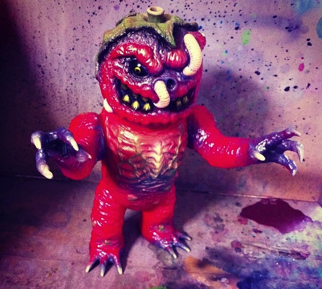 Joining the previously posted Gnaw-X, Jon Malmstedt over at Rampage Toys has just revealed the second figure in his 3-part mega collaboration with Skull Head Butt… the mighty Rotten-X! Featuring the Triclops designed/Zectron sculpted “Rotten Tomato” ball as a head, the stunning “X” body figure has been jointly produced by Rampage Toys and Marmit, standing at around 9″ tall and coming with 5 points of articulation. Making it’s debut at the Rampage x Tru:Tek NYCC booth (#208) in the pictured bright red vinyl with cream, metallic purple, black and green sprays, the initial batch will be limited to just 10 with further colorways planned for online release soon after… But that’s not all! To celebrate the release of the figure, our very own Tru:Tek – the original producer of the ball – will be offering up a very limited batch of resin protos at the con too! Due to come packed alongside an equally limited run of blank red (uncapped) sofubi balls from the main release, you can expect the full lowdown on these later in the week…