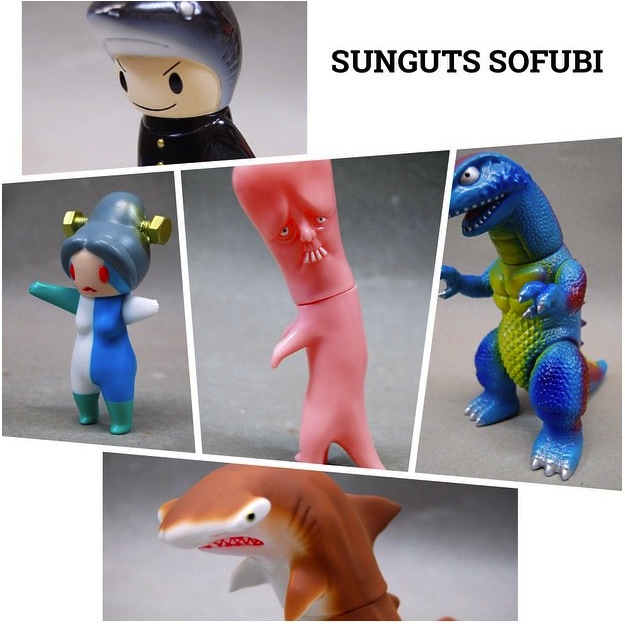 Shimomoku over at toy retailer/producer Jungle have just unleashed a whole slew of new Sunguts sofubi in their online store! Featuring the humungous Arroz Maximas in a blue vinyl with yellow and red sprays, the hideous Biloon in a light fleshy pink, Fulamon in a split blue, white, green and grey, Otoko-Zame in black and Tate-Eboshi in white with brown fades, the diverse collection of 5 figures have been priced at just 2,700yen each, aside from the considerably larger Arroz, whose comes in at 6,480yen ($59). Those interested in purchasing the figures can do so by heading over to the Jungle store right here…
