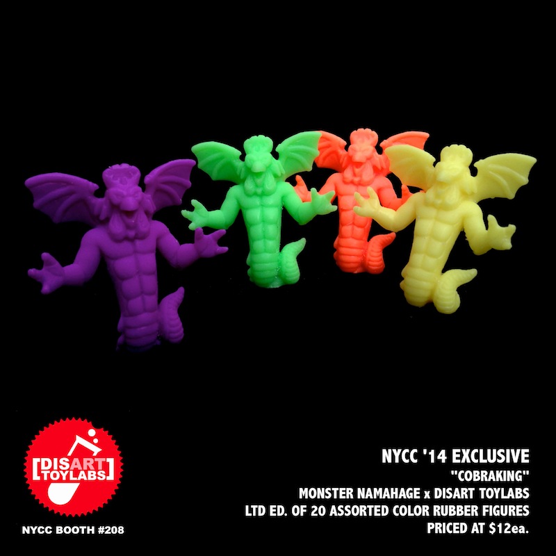 Pachi in Ya Packet “Cobraking”: Waiting in the wings since it’s first reveal way back in June, Disart ToyLabs’ collaboration with Monster Namahage, the “Cobraking” custom bootleg mini will finally see the light of day at NYCC as part of Disart ToyLabs’ “Pachi in Ya Pocket” series! Meticulously kit-bashed and re-sculpted from a mix of vintage mini figure designs, the 2″ piece has been cast in a MIMP-style UV resistant rubber. Available blind bagged in a selection of classic neon hues, these will set con goers back just $12 a piece…