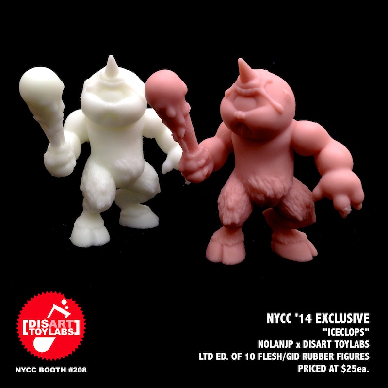 Iceclops: Originally revealed as a near-finished clay proto way back here in early July, we’re very proud to reveal that NolanJP‘s second movie themed GPK-style figure, Iceclops, will finally be making his debut at NYCC! Paying tribute to Ray Harryhausen’s iconic beast from 1958′s The 7th Voyage of Sinbad, the ingenious mash-up of monster and doll stands at around the same height as the previously released Scary Larry at 2.5″, coming complete with – in true GPK style – an icecream cone horn and lumbering mace. As with the Leucotomy Ball, Iceclops will be making his first appearance in 2 of Disart’s favourite colors; flesh and classic green GID, both coming cast up by Tru:Tek in a UV resistant, keshi-style rubber. Limited to just 10 of each, both editions come packed in a GPK inspired foil pack for just $25 each…