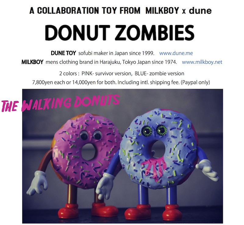 Shingo Yasuda over at Tokyo-based clothing brand Milkboy has teamed up with Dune Toy for the release of his debut sofubi, the Donut Zombies! Standing at around 4″ tall and coming with 4 points of articulation, the tasty little undead treats will initially be offered up in 2 different colorways; a “Survivor” pink and “Zombie” blue, each coming with a mass of sprays, hand painted detailing and googly eye inserts. Due to be touching down in the Milkboy store in the near future, the figures will be up for grabs at just 7,800yen ($73) each or 14,000yen ($131) for the pair. Stay tuned for more details on the drop very soon!