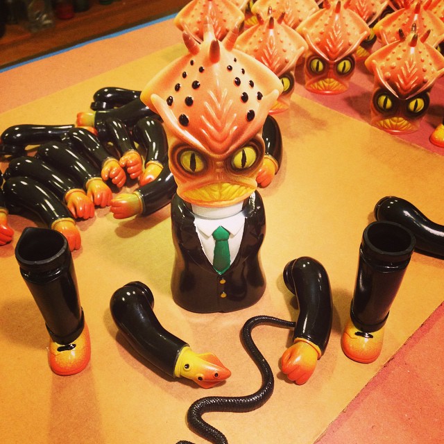 Frank Kozik has just revealed that his Salary Ika sofubi is set to return for a special “Mr Treat” colorway! Created as one of four exclusives the artist will be bringing along to the grand opening of new San Francisco-based toy store Woot Bear, the 9″ tall figure has been produced in a black soft vinyl this time around, coming complete with yellow, brown and orange sprays plus white and green masked detailing. Touching down at the event next Saturday, October 25th at 6pm, be sure to keep an eye on the shop’s dedicated Facebook page here for exact release details soon…