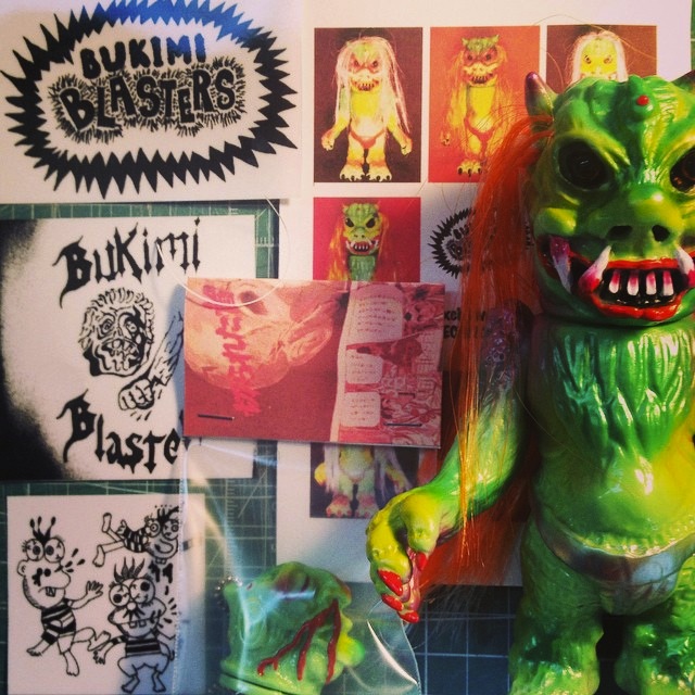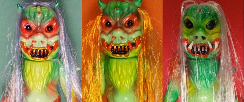 Shigeo Endo over at Bukimi Blasters has just revealed that his Evil Demon sofubi will be making it’s next appearance at Designer Con 2014 next month! The first version of the 5.5″ tall figure to feature hand threaded hair, the limited run of 8 (TBC) neo-kaiju have been produced in a light green soft vinyl this time around, each coming complete with unique dark green, yellow, red and silver sprays and hand brushed detailing. Packed in a special set for the release, including a matching severed head omake, 3 Bukimi Blaster stickers and a postcard featuring all 8 designs from the run, pricing and availability for these Hairy Evil Demons are still to be confirmed. Look out for full release details closer to the event!