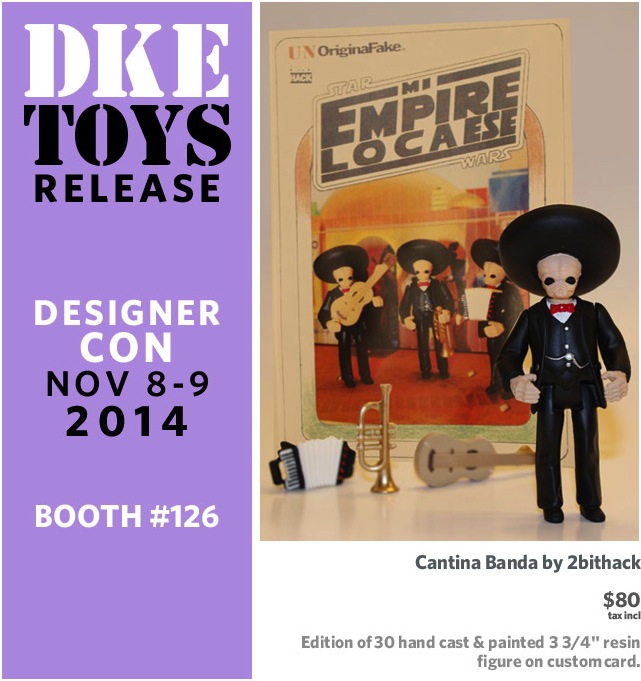 Following Healeymade’s awesome Bounty Wrestlers reveal earlier in the week, the guys over at DKE Toys are proud to reveal another exclusive custom bootleg release they’ll be bringing along to Designer Con 2014 next month, the Cantina Banda from 2bitHACK! The latest entry in the artist’s infamous Mi Empire Loca series, the 3.75″ kit-bashes both vintage Boss Hog and Figrin D’an figures to create a hilarious mariachi themed mash-up of Star Wars’ iconic Cantina band. Hand cast in resin and painted by the artist, each figure comes mounted on a custom Mi Empire Loca cardback, complete with guitarron, accordion and trumpet accessories! Limited to an edition of 30 figures priced at $80 each, the Cantina Banda will be up for grabs at the DKE DCon booth (#126) from November 8th to November 9th. Look out for more DKE exclusives on the site soon!