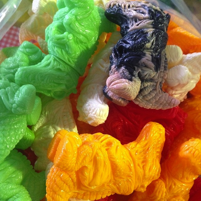 Following its debut at NYCC earlier in the month, Luke Rook over at Lulubell Toys has revealed that the Rancid Raptor sofubi is set to return for a special Designer Con 2014 exclusive “Grab Back” bag release! Designed and sculpted by James Groman and produced by Lulubell in Japan, the 2-part, 4″ tall sofubi mini is the first in a series of companion figures for the gigantic Rotten Rexx. Whilst little is known about the release save the above image at present, it would appear that the little guys will be offered up “blind bag” style, coming in a selection of different colors including light green, GID, orange and a super-limited flesh/black marble. Stay tuned for more info on the release closer to the event in just a couple of weeks time!