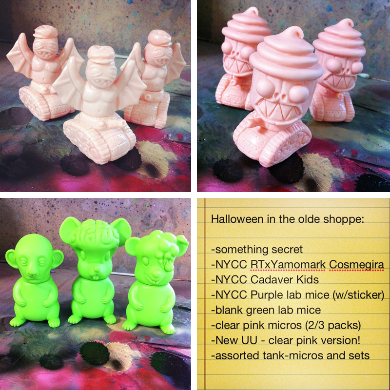 Jon Malmstedt over at Rampage Toys has just revealed a whole slew of figures he’ll be releasing in-store this Friday, October 31st as part of the huge Rampage Halloween sale! Featuring a number of leftover items from NYCC including the RT x Yamomark Cosmegira, NYCC Cadaver Kids and Lab Mice, these will also be joined by a ton of new items too, with highlights including the pictured assorted tank-micros and sets, blank green Lab Mice, GG micro 2-3 packs, plus the latest Ugly Unicorn run in a clear pink soft vinyl! Pricing and edition sizes are all still to be confirmed at present, so be sure to keep a close eye on the Rampage Toys Instagram feed here for the full lowdown later in the week…