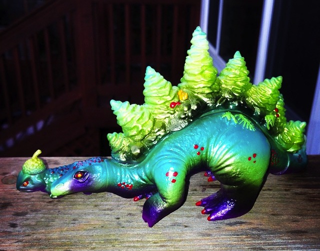 Artist Jesse Narens has partnered with HipHopRobot‘s Mark Bentley for the latest edition of his debut sofubi, Stegoforest! Standing at around 5″ tall and coming with 3 points of articulation, the nature loving dino has been cast in a green vinyl this time around, coming with a plethora of metallic blue, purple, green and black sprays courtesy of Mark. Packed with mini matching Acorn Warrior omake, the limited batch of 5 figures are currently up for grabs by e-mailing Jesse directly at jesse@jessenarens.com. Priced at just $65 each, expect any leftovers to be heading to DCon with Mark next month…
