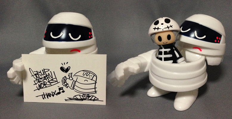 Having debuted at Taipei Toy Festival earlier in the month, the guys over at GRUP Design Works have teamed up with P.P. Pudding for the first online release of their adorable Rimey sofubi! Based on GRUP’s signature mummy character, the 4″ figure has been sculpted by none other than Kenth Toy Works, coming in at around 4″ tall with 2 points of articulation. Produced in a white soft vinyl with minimal black and red sprays for the release, this exclusive version also features a modified neck joint so that the head can be popped off to fit P.P. Pudding’s own figure, Honeheru (sold separately). Currently up for grabs in the P.P. Pudding store right here, Rimey has been priced at 3,200yen ($30) plus shipping…
