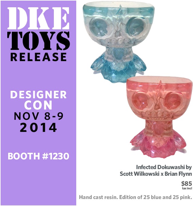 For those of you who missed out on Super7‘s recent Infected Dokuwashi preorder – or if you’re looking to bag the awesome figure in a different color – you’ll be glad to know that the guys over at DKE Toys have secured an exclusive run for Designer Con 2014 this weekend! Featuring an internal resin skeleton hand crafted by the “Infected” master Scott Wilkowski, the classic Super7 figure has been double cast in 2 translucent colorways this time around, a gorgeous light blue and pink. Both limited to editions of 25 priced at $85 each, the Infected Dokuwashis will be up for grabs at the DKE DCon booth (#1230) from November 8th to November 9th. Look out for more DKE exclusives on the site soon!
