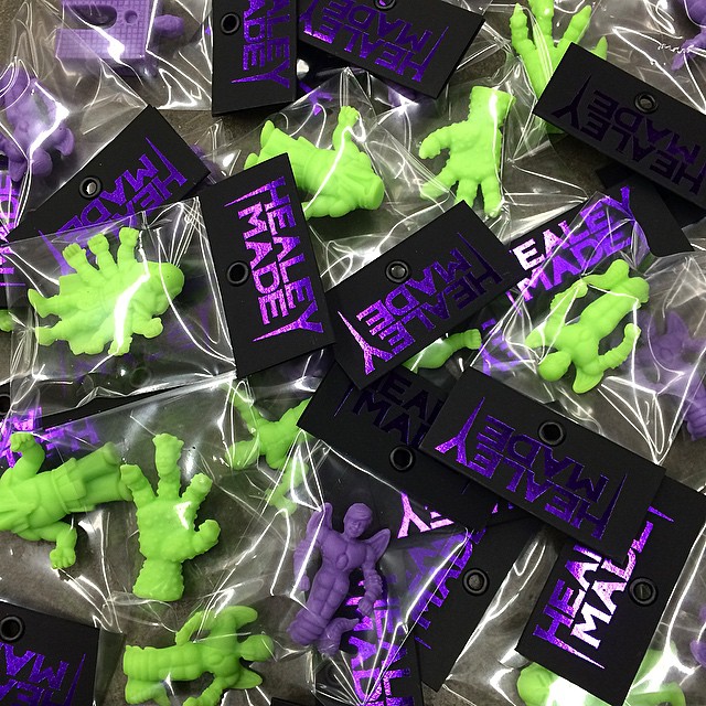 Healeymade has just unveiled that his latest figure, Trou Noir, will be debuting at Designer Con 2014 this weekend. With a name that rather aptly translates as “Black Hole”, the 6″ figure has actually been booted from a French “Black Hole” Kinnikuman knock-off, coming cast in a gorgeous metallic glitter purple resin that mimics the infamous mini figure bootlegs of the 1980s. Touching down at the Galactic Jerkbags booth (#1228) alongside a whole host of MUSCLE/MASK minis in both MIMP purple and green, pricing and edition size for Trou Noir are still to be confirmed…