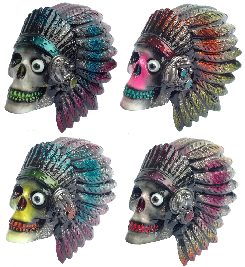 The guys over at apparel brand Scumbags & Superstars have teamed up with MechaVirus for a special micro-run of custom “Glitter” Skull Chiefs! Standing at around 4″ tall (a little larger than a baseball), the mascot head figures have been cast in a silver glitter filled soft vinyl this time around, each coming with a multitude of unique metallic sprays, custom “mecha” head sets and glass eye inserts. Limited to a run of just 4 pieces, the “Glitter” Skull Chiefs can be found in the S&S store right here for $85 each plus shipping…
