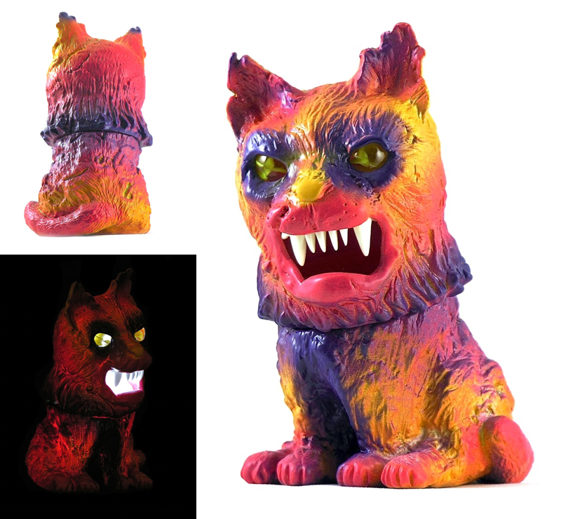 Originally available to Japanese customers through the Medicom Toy store, the elusive Kaiju Coup’s “Evil” Warui Neko is now finally available in the US via lottery! Standing at approximately 6.5″ tall and coming with articulation in the neck, the soft vinyl “alley cat of Kaijuland” has been adorned with a mix of eye catching orange, yellow and purple sprays courtesy of Plaseebo, finishing with swirled glass inset eyes, white resin cast fangs and an internal motion activated color-changing LED unit with replaceable batteries. Limited to an edition of just 7 priced at $220 plus shipping, anyone looking to sign up to the lottery is going need to send their name, address and PayPal address to bob@plaseebo.net before Wednesday, November 26th…