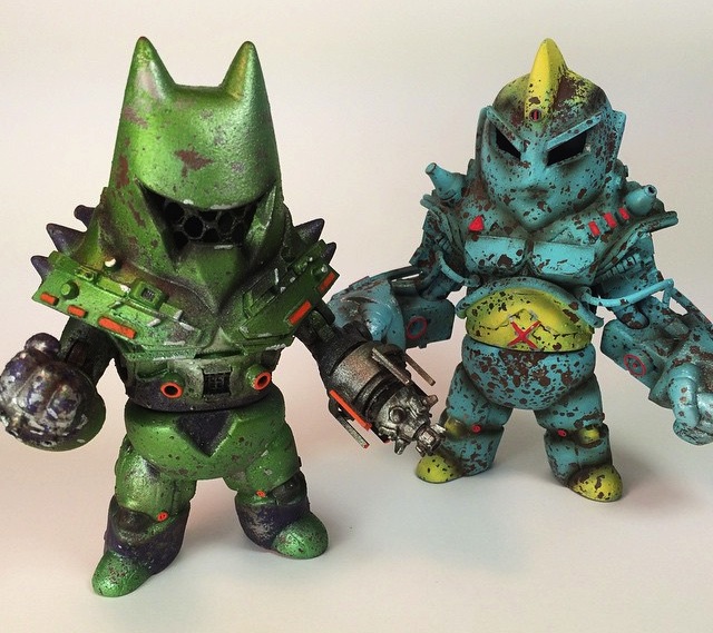 Artist Will Long aka Buildbots has taken on Max Toy Co‘s Maxx Bots for his latest round of one-off customs! Utilising both bat-ear and mohican variants of the 2-part sofubi mini, the pair have been treated to Will’s instantly recognisable blend of kit-bashed found objects and meticulous weathered paint detail, both coming complete with all-new articulated arms and cut out, mesh backed masks. Currently available by e-mailing Max Toy directly at info@maxtoyco.com, the Maxx Bots have been priced at just $150 each… Here’s hoping we see more of these little guys from Buildbots soon!