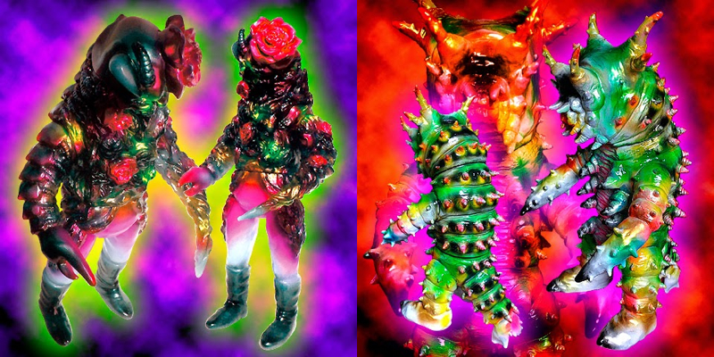 Hot on the heals of the recent Cobra Ningen release, BLObPUS is proud to reveal that he’s teamed up with Yamomark for yet another round of open-run sales, proudly presenting the Barabaran and Cosmegira GID Set! Both produced in BLObPUS’ signature glow in the dark vinyl, the pair have been treated to a number of contrasting sprays; Barabaran coming in a stunning mix of blue to crimson rose, and Cosmegira, inspired by the covers of the Japonika plant books, a selection of lush greens, pinks, yellow and gold. Priced at 17,000 yen ($146) as a set or just 8,800yen ($76) for Barabaran and 8,500yen ($73) for Cosmegira separately, the figures will be available via open preorder through the BLObPUS blog right here until Tuesday, December 9th…