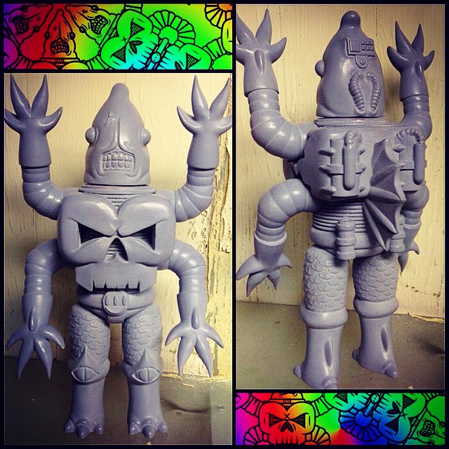 Up and coming toy customiser Videov0mit has just unveiled the prototype for his debut sofubi, CZERNOBOG! Designed by Videov0mit and digitally sculpted by iamscumbag, the towering 9″ of sub-aquatic terror cherry picks choice elements from both classic kaiju and cult horror, featuring 4 tentacle-like arms, a finned robotic torso, skull chest piece and a creepy, teeth clenched, shark-like head. Due for production in soft vinyl courtesy of Velocitron in late Spring 2015, be sure to keep a close eye on the Videov0mit Instagram feed right here for more updates on this promising figure soon…