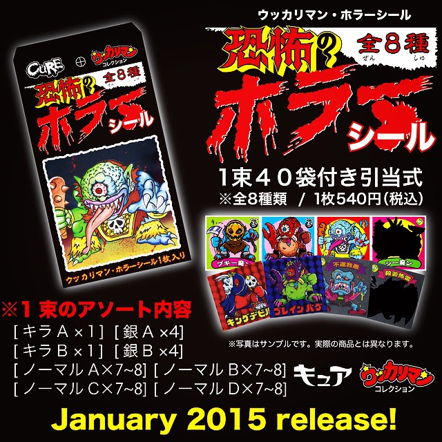 In a follow-up to our recent reveal of the Ukkariman sofubi, creators Cure Toys have just announced a companion Bikkuriman-style sticker series that will drop ahead of the toys in early 2015! Offering up a total of 6 different designs along with 2 chases across alternative A and B sets, the authentic 1.5″ x 1.5″ holographic stickers feature the previously revealed Fungah, King Devil and Giant Ghoul, alongside 2 versions of Jame’s Groman’s Brainbug and Pumpkin Head amongst others. Whilst specific release details remain unclear at the moment, it would appear that we’ll be seeing these in the West courtesy of Lullubell Toys at some point in January. Stay tuned for more news on the stickers – and more importantly, the toys! – in the near future…