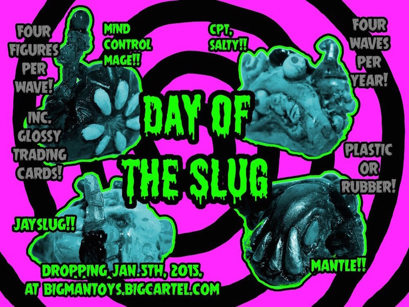 Kicking 2015 off with a bang, Lee Burbridge over at Bigmantoys has revealed an all-new line of mini figures… The Day of the Slug! Heavily inspired by Tim Clarke’s Mini Boglins, the 1″-1.5″ tall figures have been designed and sculpted by Lee, with each mutated mollusc based on either a horror theme or direct film parody. Set to be released across 4 super-collectible waves of 4 figures a year – that’s a total of 16 in 2015!) – the first will feature the pictured Mind Control Mage, Cpt. Salty, Jay Slug and Mantle in a selection of hand cast resin and rubber finishes. Due to make their debut on the Bigmantoys store on Monday, January 5th, DotS: Wave 1 will be available through 2 different buying options; singularly for $10, or just $30 for the “Value” 4 pack; Bigmantoys will also be offering up super-glossy trading cards of each character for an additional $1 per figure… Stay tuned for news of the next wave over the coming months!