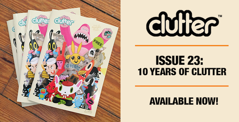 The guys over at Clutter Magazine are proud to reveal that the latest issue (#23) of their free print publication is now up for grabs! Celebrating the publication’s 10th anniversary in style, the Winter 2014/15 issue packs in interviews and features with – amongst others – Bwana Spoons, Frank Kozik, and Splurrt, as well as the third article for the mag from our own editor-in-chief, Tru:Tek- a fully comprehensive guide to The Disarticulators’ keshi! Spanning across 4 pages this time around, the whistle stop tour covers every release from the “Critters Inspired” Mini Figure right up to the recent Leucotomy ball and beyond- an article that we’re sure our regular readers aren’t going to want to miss out on… Anyone looking to grab a copy can currently find it in the Clutter store right here, with free copies due to touch down at your local specialty retailer soon- have them hit up DKE Toys Distribution if they’re not stocking it already!