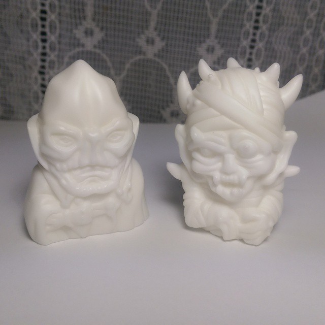 Originally teased here and here over the past couple of months, DeathCat Toys‘ new finger puppet-style figures have just been realised in resin courtesy of DuboseArt! Designed by DeathCat’s Johan Ulrich and sculpted by KtoKto, the pair – Oni Mira and the as-yet-untitled masked character – have been heavily inspired by Bikkuriman and the classic Ma-Ba Zombies toy line, sculpted in-scale at around 3″ tall and coming with an authentic split torso design. Presumably produced in resin for a limited prototype release ahead of the official soft vinyl debut later in the year, expect more details on this must-have release soon…