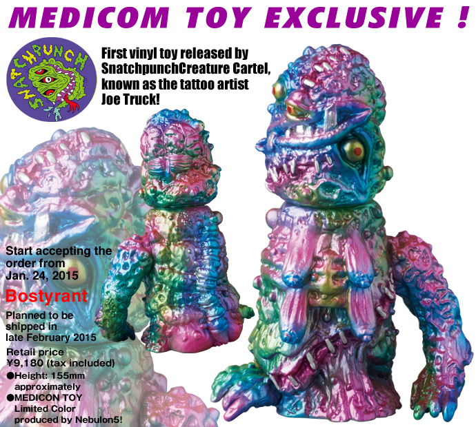 Having seen sell-out releases at NYCC, Designer Con and Toy Art Gallery over the past few months, Joe Truck Kasher over at Snatchpunch Creature Cartel is proud to reveal that his debut sofubi – the queen of gross known as Bostyrant – has received an exclusive colorway through Medicom Toy! Designed by Joe, sculpted by Grizlli Atom aka GNOSIS and produced by Velocitron, the mid size, 4-part soft vinyl figure comes brimming with gruesome details, including multiple oozing eyes, gaping, stitched flesh and four putrid, witch-like udders- all sprayed up in a stunning multi-metallic paint app conceived by Nebulon5. Currently available in Japoan through the Medicom Toy store for just 8,500yen ($72), overseas customers are going to need to fill in the dedicated lottery form right here before close on February 10th to be in with a chance of securing the beast…