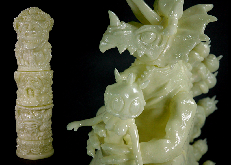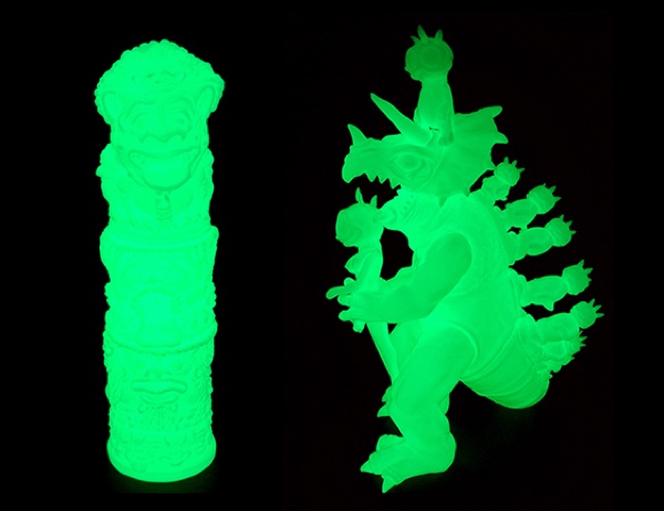 The guys over at Toy Art Gallery are proud to announce that they’ll be kicking off a whole week dedicated to Glow in the Dark this Wednesday, January 5th! 2 different figures from TAG’s extensive vault of sofubi will be up for grabs in GID, the first coming in the form of Boglins creator Tom Clarke’s awesome Totims. Standing strong at 12″ tall, the totem-style figures feature a total of 4 individual parts that can be mixed and matched with previous releases, coming in at just $75 each… Next up we have the colossal Modzilla from Ron English. Standing at a monstrous 13″ tall, the technically impressive figure features a total of 20 soft vinyl parts, including removable Rabbbit and Bunnny figures. Priced at $150, Modzilla will be joining the Totims in the TAG store tomorrow at 12pm Pacific time…