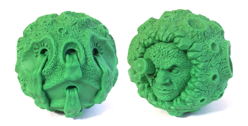Revealed right here in test-shot form last month, we are very proud to finally be able to share The Disarticulators‘ Oozeball sofubi in it’s initial “OG Ooze-It Green” colorway! Here’s the blurb for the figure… “A follow-up to last years hugely popular keshi-ball release, the DA’s Tru:Tek has completely redesigned the figure from the ground up for the new medium, opting for a more organic, Ooze-It like face, paper clay-style textures and the pièce de résistance… a hidden face inspired by Georges Méliès iconic 1902 silent movie, Le Voyage dans la Lune! Beautifully sculpted by none other than Zectron, the 2-part design has been upscaled from the original 2″ diameter to little over 3″- making it both more in-keeping with the classic Madball scale, and, more interestingly, compatible with a wide variety of mid-sized kaiju with the capped base removed…” With the first batch of green balls making their way over from Japan to the UK in the next week or so, those savvy enough to jump in on the preorder back in November will be receiving their orders very soon… And to those that didn’t? Well you’ll be glad to know that a small reservation has been put to one side for a release in the Man-E-Toys store over the coming weeks. But that’s not all! Rampage Toys will be unveiling the first ever painted version of the ball at Wonderfestival Winter 2015 this weekend- be sure to stay tuned for a full reveal plus release details tomorrow!