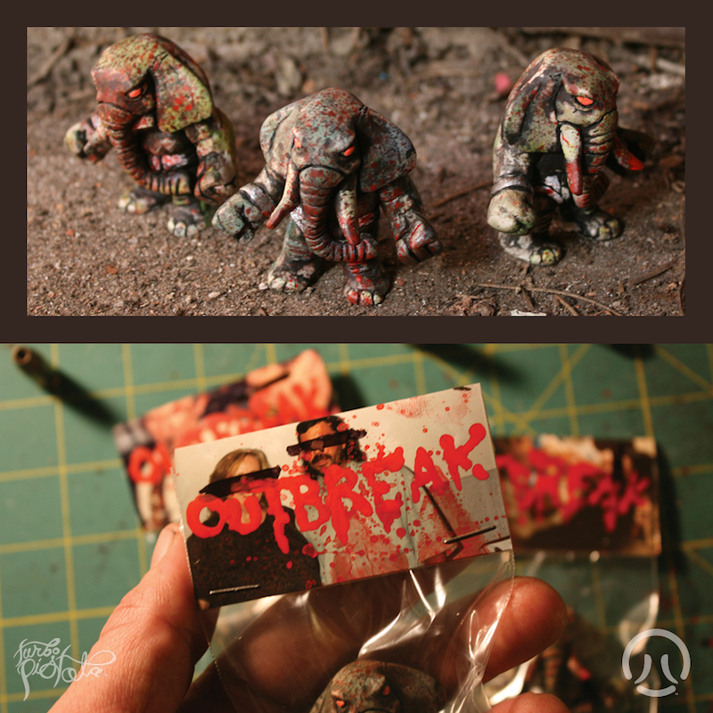 After over a year away from the toys, our good friend Daniel Smith aka Turbopistola returns with a special “Outbreak” run of Elephantos resin minis! Created to coincide with the Days of the Dead: Atlanta Horror Convention this weekend, the stunning hand cast resin figures have been treated to multitude of gruesome looking paint applications, each coming packed with a hand painted header made from discarded 35mm photographs. Available at the 13 Stories Haunted House booth today (2/6) right through until Sunday, January 8th for just $25 each, those unable to attend will be glad to know that the “Outbreak” Elephantos can also be purchased through the Turbopistola store via an open-preorder for the duration on the con…