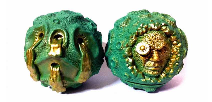Coming a little later than planned, we bring you images – and a video courtesy of MildThree – of the painted sofubi Oozeballs that went on sale at Wonderfestival Winter 2015 yesterday! Here’s the blurb on the figure for the uninitiated few “A follow-up to last years hugely popular keshi-ball release, the Oozeball has been redesigned by The Disarticulators’ Tru:Tek from the ground up for the new medium, featuring a more organic, Ooze-It like face, paper clay-style textures, plus a cheeky little extra… a hidden face inspired by Georges Méliès iconic 1902 silent movie, Le Voyage dans la Lune! Beautifully sculpted by none other than Zectron, the 2-part design has been upscaled from the original 2″ diameter to little over 3″- making it both more in-keeping with the classic Madball scale, and, more interestingly, compatible with a wide variety of mid-sized kaiju with the capped base removed…” Produced in a super squishy matt vinyl with simple gold factory sprays for this first release, the pièce de résistance came in the form of a little surprise added at the final stage of production- a fully functional vintage-style squeaker! Whilst the limited run sold out at the event, we will have a limited supply – complete with said squeakers – in both an alternative painted colorway and the OG Ooze-It green coming later this month… Stay tuned for more news soon!