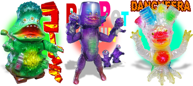 Regular as clockwork, Elegab is proud to reveal that his lottery sales for February are now live! Keeping up the momentum of last month’s release, a total of 4 figures are up for grabs again – tank beast Warsgon, standing at just over 9″ tall and coming in a clear yellow vinyl with metallic green, blue, red and yellow sprays; construction site monster Kougira, coming in at 8″ and cast in a green vinyl with yellow, red and metallic teal sprays; the 9″ tall Puppet Seijin in a gorgeous clear violet vinyl with metallic blue, red and green sprays; and Dancheera, produced in a clear vinyl with an assortment of neon sprays – all come in at a very reasonable 8,000yen ($67) each plus shipping. The deadline for all 4 lotteries has been set for this Sunday, February 15th, so be sure to head over to the Elegab site and get your entries in quick!