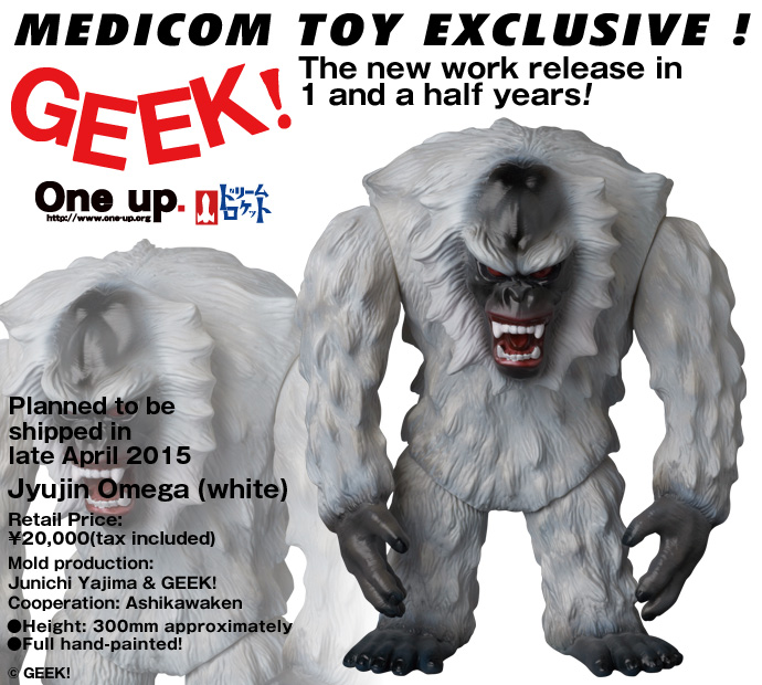 Making it’s debut at the Osaka Soft Expo over the weekend (check it here), GEEK! x One Up’s Jyujin (Beastman) Omega has just received it’s second release this month as a Medicom Toy exclusive! A follow-up to GEEK!’s original 2013 Jyujin sofubi, the breathtaking piece features a similarly impressive scale, standing at just under 12″ and coming with articulation both in the arms and legs. Produced in what appears to be a light grey soft vinyl and coming with red, white, grey and black sprays, the Medicom exclusive Jyujin Omega is currently available to Japanese customers here for 20,000yen ($169), whilst overseas collectors are going to need to fill out the dedicated form right here…