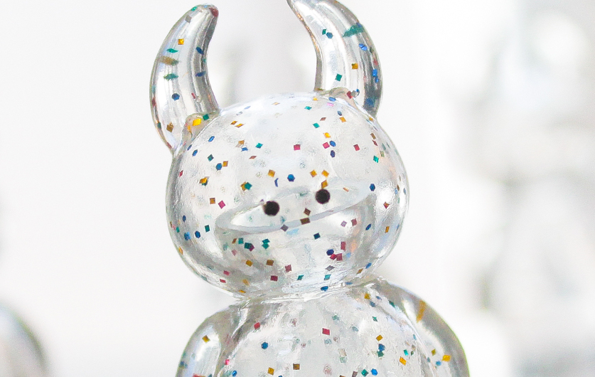 The guys over at Uamou are proud to reveal that their “Mini” signature figure is now up for grabs in a gorgeous new “Stardust” colorway! Coming in at around 1.5″ tall, the tiny little fella has been produced in a crystal clear soft vinyl infused with a mesmerising 5 color glitter lamé. Currently available in limited quantities on the Uamou store right here, the Mini Stardust Uamou can be yours for just 900yen ($8) plus shipping…