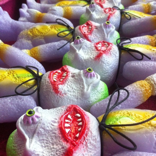 Adam T aka SLAVExONE has just revealed that he’ll have a new Joker-inspired Gero micro-run dropping soon! Produced in a lavender colored soft vinyl, treated to a mix of authentic white, red and yellow sprays and finished with a green dolls eye insert and neck tie, expect the super-limited run to make its way into the SLAVExONE store soon… But that’s not all! Teaming up with Unaffiliated SJ, Adam will also be offering up a special omake mini figure as part of the release! Dubbed “Tesaki”, the 2-part, yokai-inspired piece has been hand sculpted by Unaffiliated SJ, presumably coming cast in resin ahead of a soft vinyl release later in the year. Be sure to stay tuned for more news on both the “Joker” Gero and Tesaki mini as soon as we hear anything…