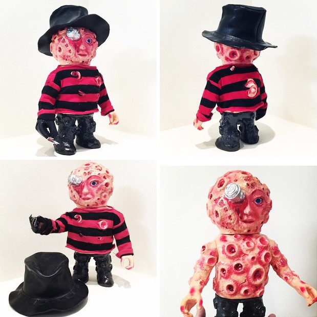 We don’t seem to feature too many privately commissioned customs on Man-E-Toys these days, but upon seeing the latest work from Japanese artists Le Kuo and Gusion M, we simply couldn’t resist… presenting their incredible “Freddy Krueger” Longneck Moon Maijin! Garnering a huge amount of attention recently for their miniaturised apparel-based customs, the pair’s latest, Nightmare on Elm Street-inspired piece follows a similar approach, featuring a hand sewn red and black striped jumper, spiked glove and leather fedora over the top of a gore-soaked flesh and black paint app. Whilst unfortunately already in the hands of one seriously lucky collector, anyone interested in bagging a similar piece can hit the guys up at vicious0310@gmail.com with their enquiries…