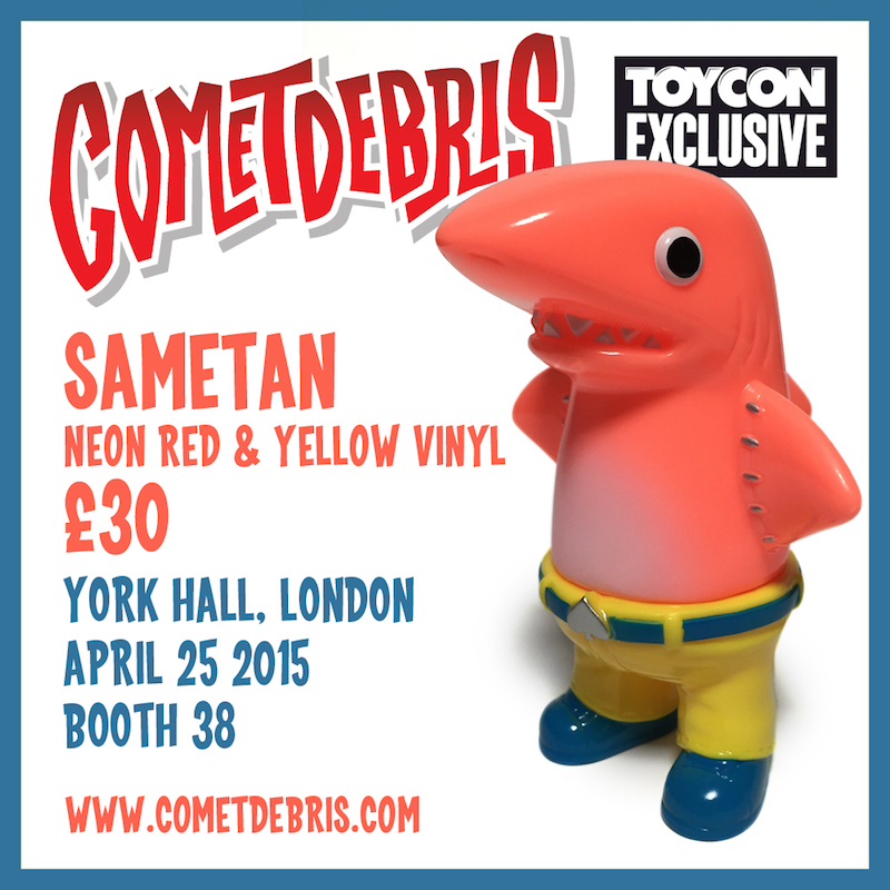 Joining the previously posted “Marbled Green” Kappa Kid, “Glow” Kappa Shonen and “Black Glitter” Ace Robo, Koji Harmon over at Comet Debris has revealed yet another exclusive figure he’ll have up for grabs at ToyCon UK next weekend, the “Neo Red and Yellow” Sametan! Produced in a mixed-part neon red and bright yellow soft vinyl, the 4.5″ tall piece has been treated to a minimal mix of light white accents and dark blue masked sprays. Priced at just £30, the limited edition figures will be up for grabs alongside a number of other soon-to-be-announced pieces at the Comet Debris booth (#38) on Saturday, April 25th… Look out for more reveals – including a batch of marbled glow/blue Suns of Broadarr and red glitter Electric Boys – soon!