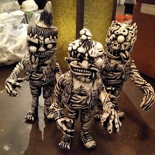 Originally teased here earlier in the week, the “Goon Squad” mega collab from GNOSIS, Monster Island and Pop Soda had just been revealed in-full! Unlike originally thought, the previously posted sculpts WON’T be used for a Madball-style release, but are in fact heads for a series of full-size, Rat Fink inspired figures! Loosely based on the (sadly canned) E-Ball-A figure revealed a while back, the trio – Electric Finkinstein, Shroom Goon and Pop Soda – have been sculpted by GNOSIS’ Grizlli Atom, coming in at around 8″ tall with articulation in both the arms and head. Prototyped in a white, black rubbed resin by Monster Island for a limited release at the GNOSIS group show at TAG tomorrow (4/18), we’re told to expect the gang in soft vinyl courtesy of Pop Soda later in the year. Look out for more news on these guys soon…