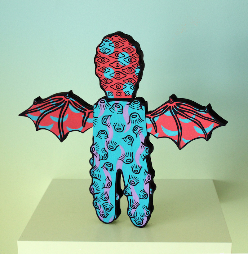 Continuing his onslaught of releases over the next few weeks, Alex Gavryushenko over at New York-based apparel and toy brand Psycho Scimitar has just revealed the latest creation to hit is store, the awesome “Prosciutto- Batto- Volcano” wooden figure! Standing at an impressive 11″ tall with a 12″ wing span, the eye-catching piece comes hand cut, screen printed and fitted with articulation in the head and arms. Initially up for grabs in a stunning blue/purple/red with a black trim, look out for “Prosciutto- Batto- Volcano” in the Psycho Scimitar store later today (4/17) for just $45 plus shipping… Stay tuned for details on the next release soon!