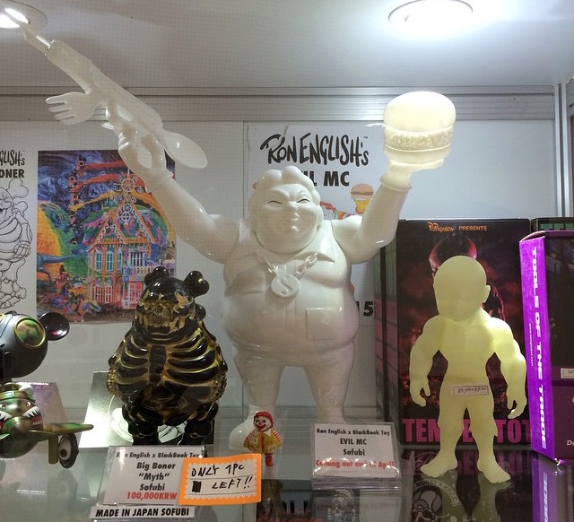 Originally teased here back in December of last year, BlackBook Toy‘s latest collaboration with Ron English and Popaganda – Evil Mc – has finally been revealed in full! Based on the reoccurring character seen in many of English’s paintings, the sinister-looking fast food anti-mascot has been realised in 3D by the talented Chop over at Monster Farm, standing at well over 13″ tall and coming with an impressive 8 points of articulation. Making it’s first appearance in prototype form at ATC 2015 over the weekend – complete with detachable fast food gun and jumbo hamburger accessory – the hulking figure will be making it’s painted retail debut at Superfestival 68 this coming Sunday, April 26th for an undisclosed sum. Be sure to keep checking the BlackBook Instagram feed here for the full lowdown later in the week!