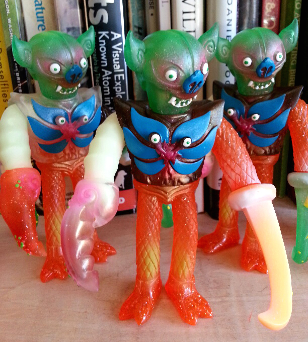 Bwana Spoons over at Gravy Toys has just unleashed his latest Suns of Broadarr micro-run online, the “Batshit” mixed-part Jeffs! Featuring a mash-up of different parts from both Jeff and Lonny figures, these 5″ tall creations have been cast in a mix of glitter-infused clear orange, GID, rootbeer and clear parts, coming with additional sprays and hand painted detailing courtesy of Bwana. Up for grabs in limited quantities on the Gravy Toys store right here, the “Batshit” Jeffs can be yours for just $60 each plus shipping…