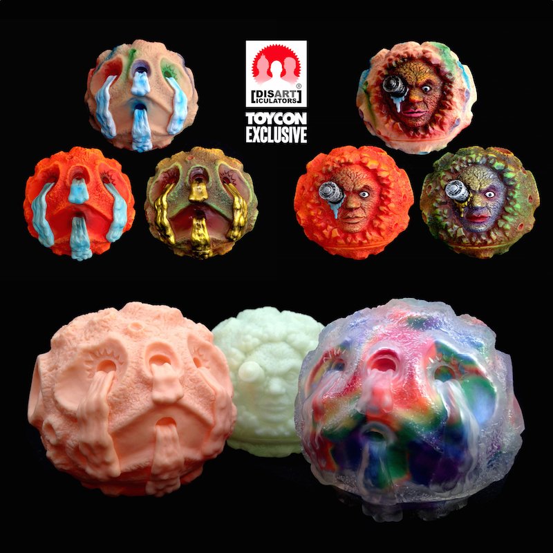 ToyCon UK exclusive “Predatooze”// Produced in a squishy clear matt soft vinyl this time around, the vintage-style “squeaky toy” has been filled to the brim with custom tie-dyed pom poms to resemble the infamous thermal imaging effect from cult 80’s flick, Predator. Limited to an edition of just 8 – including a “Deep Heat” chase – alongside just 2 variants in a “Stealth” colorway (without pom poms), the “Predatooze” Oozeballs come packed with a deluxe double sided header for £35 and £32.50 respectively.