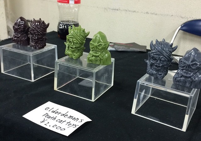 Hot on the heels of the various keshi and resin releases we’ve seen over the past few months, we can now reveal that DeathCat Toys‘ Elder Demons: Series 1 have finally made the transition into sofubi! Designed by DeathCats’ Johan Ulrich and sculpted by KtoKto, the 2.5″ tall Bikkuriman/Ma-Ba-style split torso minis – Oni Mira and the Red Pharoah – made their debut at KtoKto’s Superfestival 68 booth over the weekend, coming in a choice of black, olive green and blue/grey vinyl for just 2,000yen ($17) a set… Here’s hoping we see a general worldwide release of these soon!