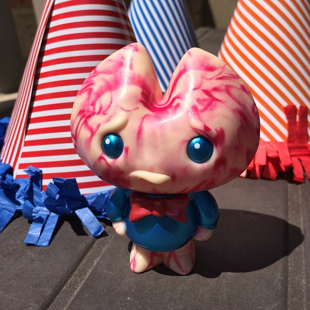 Scott Tolleson is proud to reveal that the ever so sad “Kookie No Good” sofubi is set to return this week in an all-new “Kookie Party” colorway! Produced in conjunction with online art toy emporium DeKorner, the adorable figure has been cast in a gorgeous flesh and dark pink marbled resin for this 1st anniversary release, coming with a mix of metallic blue, red and white sprays. Limited to an edition of just 40 priced at $35 each, expect the little guy to touch down in the DeKorner store this Friday, May 1st at 10am Pacific time…