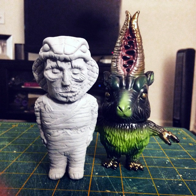 Joe Merrill aka Splurrt is proud to reveal the latest figure to join his ever growing line up of sofubi, the stunning Serpent Sata! Created as a companion figure to Usir (pictured), the Ancient Egypt-inspired mummy has been sculpted in-scale at around 4″ tall, featuring a 2-part design with an oversized head that retains the series’ goofy, SD-like feel. Due to head to Japan for soft vinyl production soon, be sure to stay tuned for news of Serpent Sata’s debut over the coming months…