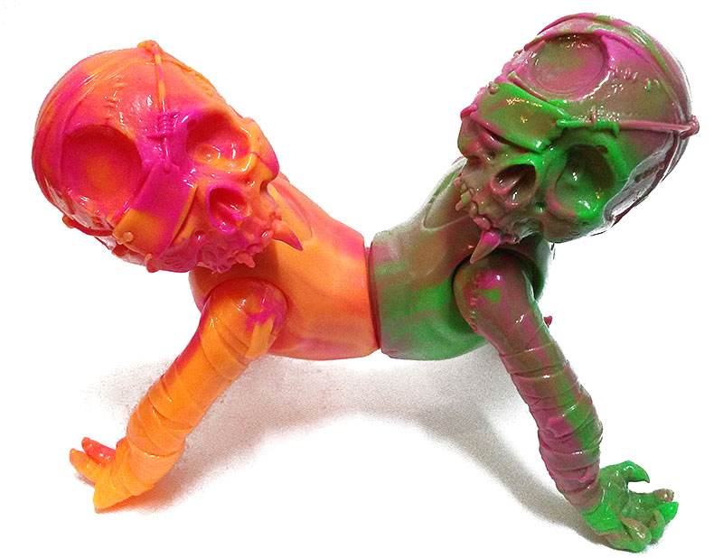 Secret Base are proud to reveal that Pushead‘s elusive siameseORM sofubi has returned in an all-new “patcheWerk marbHouse” colorway! Designed by Pushead and sculpted by Betch, the 5″ tall figure features features 2 conjoined skullORM torsos that have been cast in a mix of marbled orange/pink and purple/green soft vinyl for this release. Currently up for grabs in super-limited quantities on the Secret Base store right here for 13,500yen ($113) plus shipping, those outside of Japan can place their orders by e-mailing Secret Base directly at info@secret-b.com…