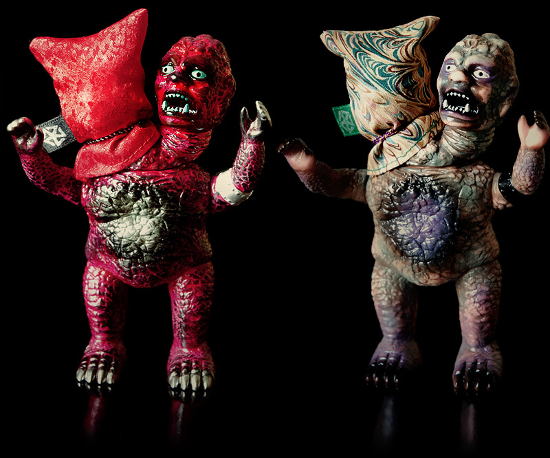 Elusive sofubi producers Uzumark are proud to reveal that their highly sought after Jinmen-jū (Human-faced Beast) figure will be returning for a limited online release very soon! Featuring 2 new colorways this time around; black with a red rub and tan with green and purple sprays, the pair both feature an as-yet-unrevealed new skull sculpt that has been covered with matching custom head bags. Due to touch down on the Uzumark blog via e-mail lottery over the next few days, pricing and edition size for the Human-faced Beasts is still to be confirmed. Stay tuned for full release details as soon as we have them…