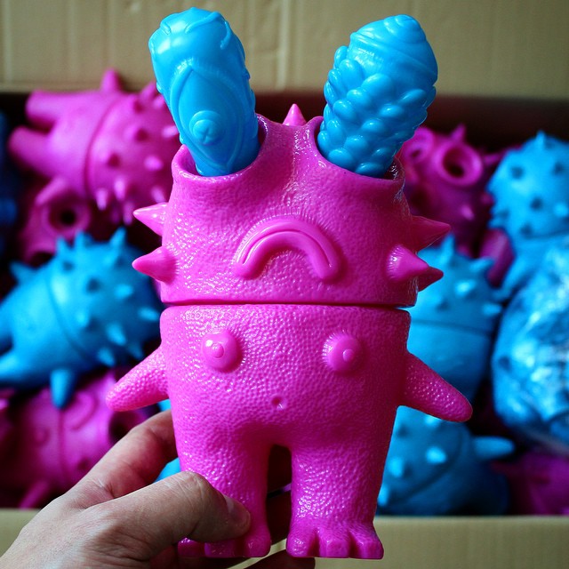 Originally revealed as a finished clay sculpt back way back in December of last year, Alex Gavryushenko over at Brooklyn based toy and apparel brand Psycho Scimitar is proud to reveal that his awesome debut sofubi is fianlly read for production! Entitled “Woebegone Mamilla” (the miserable nipple!) or Woebi for short, the crazy looking aquatic kaiju stands at around 7″-8″ tall, featuring articulation in the neck as well as 3 interchangeable eye accessories. Produced in a contrasting mix of bright pink and blue soft vinyl for it’s first release, we’re told to expect the figure in the Psycho Scimitar store at some point in the first week of June. Look out for full release details over the next couple of weeks!