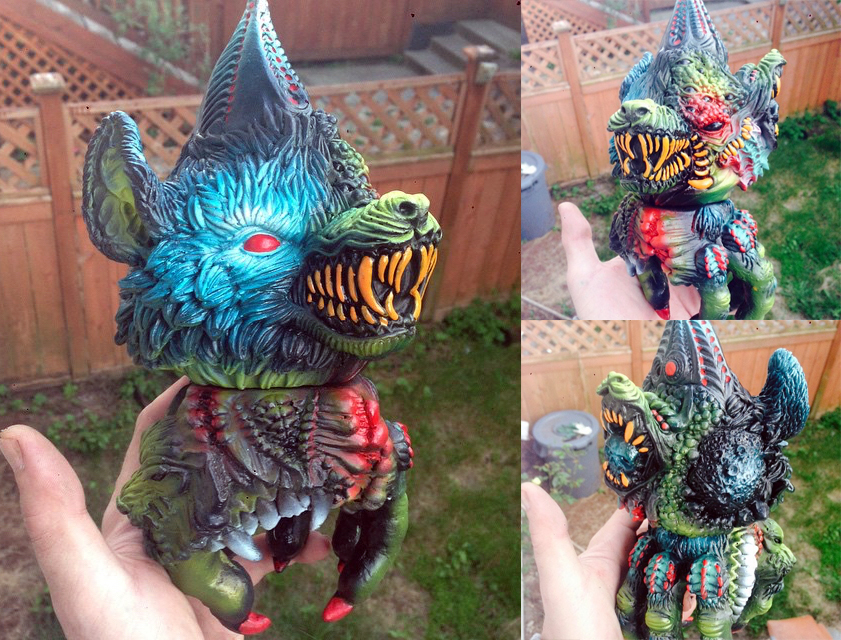 After months on the drawing board, the jaw-dropping “Canine Lupis” resin figure from MM Toys is finally set to make its debut! The fourth figure in the team’s horror infused series of teeth monsters, the huge werewolf-like beast has been hand sculpted by Maren Seibold and roto-cast by husband Mark “HipHopRobot” Bentley, amazingly coming in at just under a pound of black tinted resin. Pictured here as the very first test paint, Mark has stated that he’ll be working his magic on another before deciding which will become the first painted run to hit the HipHopRobot store next week… Look out for full release details on the figure has soon as we have them!