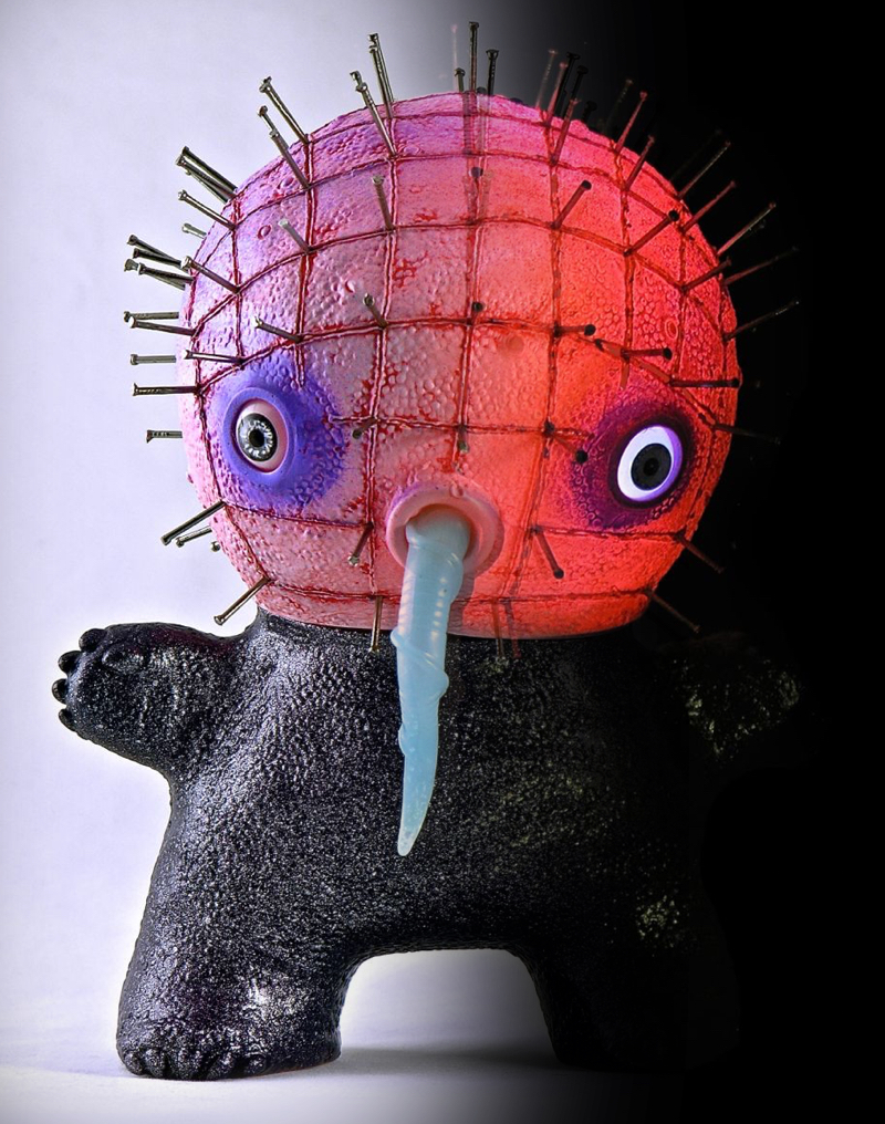 Bob Conge aka Plaseebo is proud to introduce the fourth figure in his ongoing line of Night Gamer customs inspired by cult horror flick Hell Raiser, finally taking on the leader of the Cenobites… the mighty Pinhead! A one of a kind custom featuring inset “human” eyes, open wound lines, metal pin inserts and an internal motion activated color-changing LED unit with replaceable batteries, the gruesome soft vinyl figure comes signed and dated by the artist on the base. Touching down in the Plaseebo webshop next Wednesday, June 3rd, pricing for the piece is still to be confirmed, although we’re guessing it’ll marked up somewhere between the previous releases at $550-$750 plus shipping…