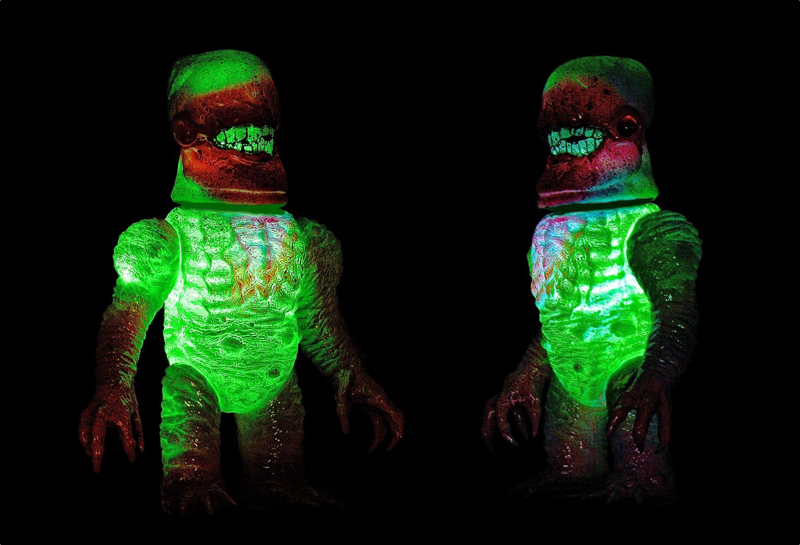 Bob Conge aka Plaseebo is proud to present the fifth one-off custom based on his GNAW-X figure! Taken from Rampage Toys x Skull Head Butt’s huge collaboration from last year, the 8″ beast features Plaseebo‘s Gnaw head sculpt on top of SHB’s standard “X” body. Jointly produced by Rampage Toys’ Jon Malmtsedt and Marmit, the figure has been cast in what appears to be a pink soft vinyl this time around, coming with layers of metallic sprays, glass inset eyes and an internal motion activated color changing LED unit courtesy of Plaseebo. Signed and dated by the artist, Gnaw-X #5 can currently be found in the Plaseebo web store right here for $350 plus shipping…